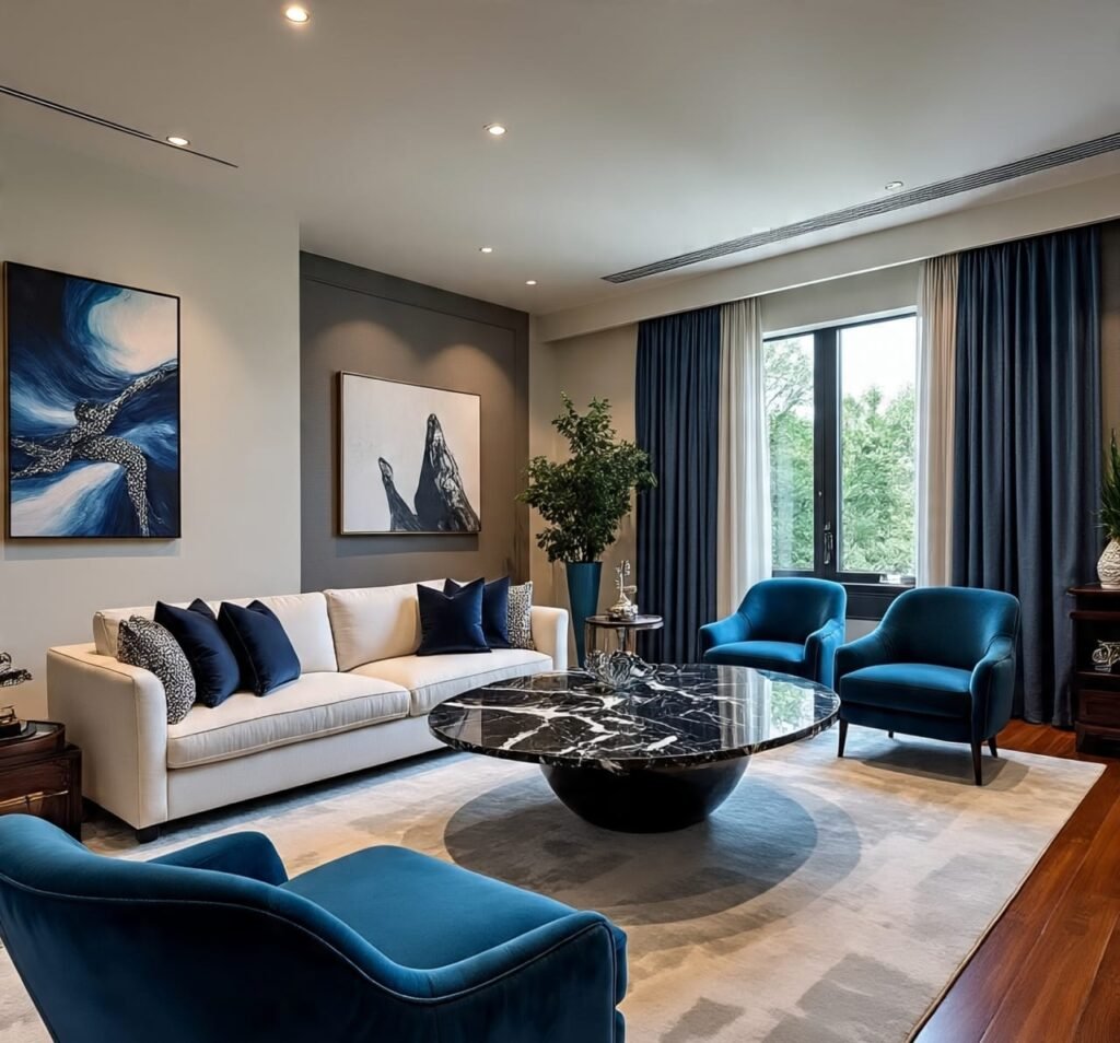 This image breathes serenity. A neutral marble table rests between blue velvet chairs and soft beige sofas, uniting cool and warm tones in harmony. Its simplicity makes it powerful — a visual pause in a busy world. The marble veins move like soft rivers across a mountain plain, grounding the room’s airiness. It’s luxury shaped in restraint, proof that beauty doesn’t always need noise. The table stands like a meditation altar, teaching balance, peace, and the enduring art of stillness.