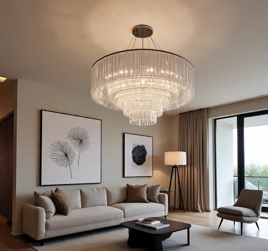 In the first image, the chandelier rests gracefully above a soft-toned living room, its clear crystals cascading like morning dew under golden light. This luxury chandelier design embraces balance — a circular formation of sleek glass drops that scatter warmth evenly across the space. The simplicity of its shape reminds us that elegance doesn’t need excess; it thrives in harmony. Perfect for modern homes, this piece celebrates quiet luxury — where form meets function, and light becomes art. Whether illuminating gatherings or moments of stillness, this chandelier whispers refinement through every glimmer.