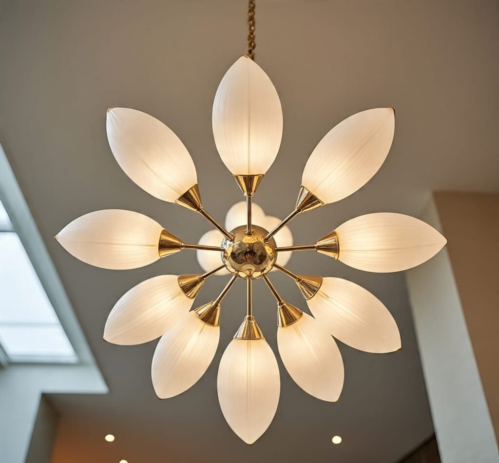 The eleventh chandelier unfolds like a sacred flower at dawn — a masterpiece inspired by nature’s rhythm. Each petal reflects soft golden light, curving gracefully toward the ceiling like the first rays of morning sun. This luxury chandelier design captures the balance between peace and vitality, echoing the harmony of earth and sky. Perfect for bedrooms or calm retreats, it invites serenity while elevating elegance. The layered petals radiate a warmth that feels alive — a light that breathes. In homes where stillness matters, this chandelier reminds us that beauty, when gentle, can heal the heart.