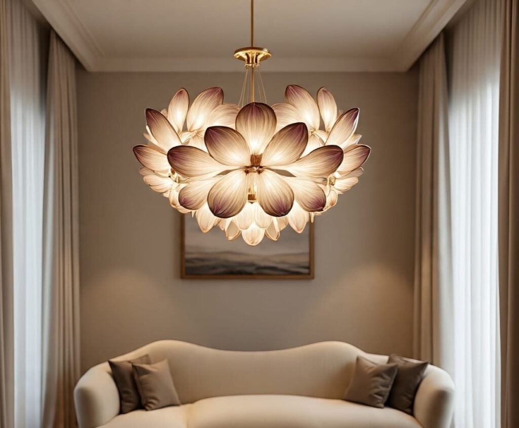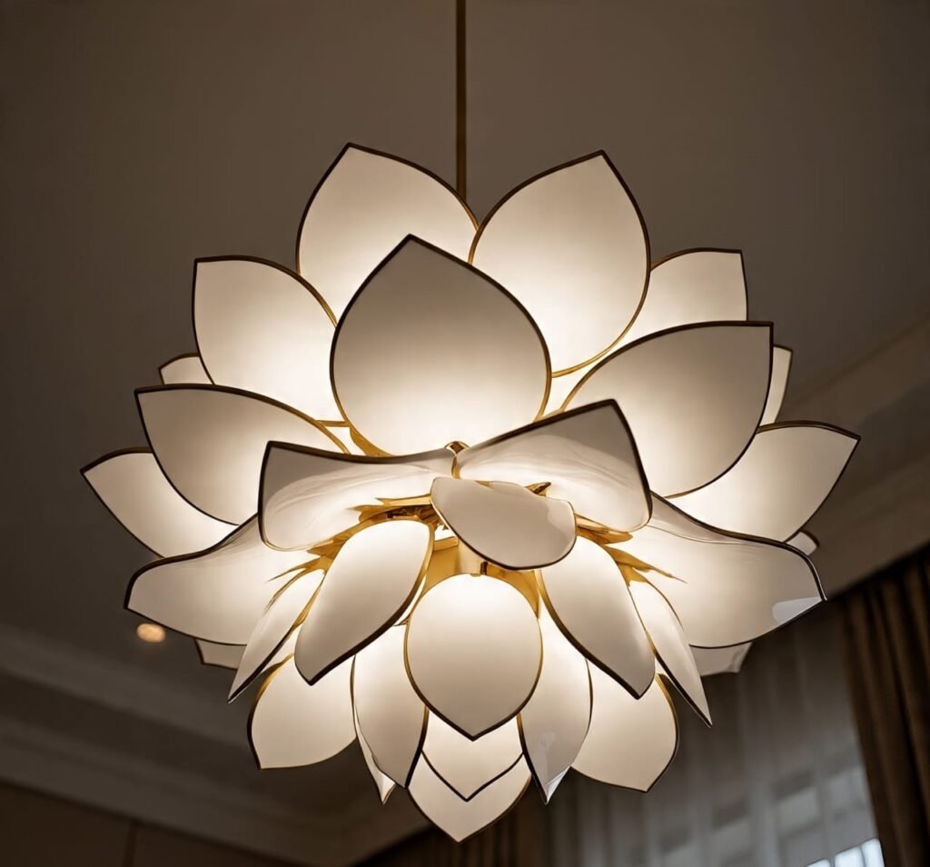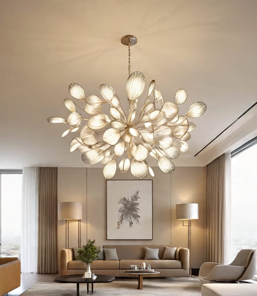 The seventh chandelier resembles a blooming flower — its petal-like shades glowing softly, forming a poetic silhouette. This luxury chandelier design draws deep inspiration from the lotus, symbolizing purity and growth. The play of shadows and soft reflections creates an intimate ambiance, perfect for bedrooms or reading nooks where serenity is sacred. It’s more than lighting; it’s a spiritual centerpiece that connects modern craftsmanship with the timeless grace of nature. Every beam it emits feels gentle, as if drawn from dawn’s first light over still waters.