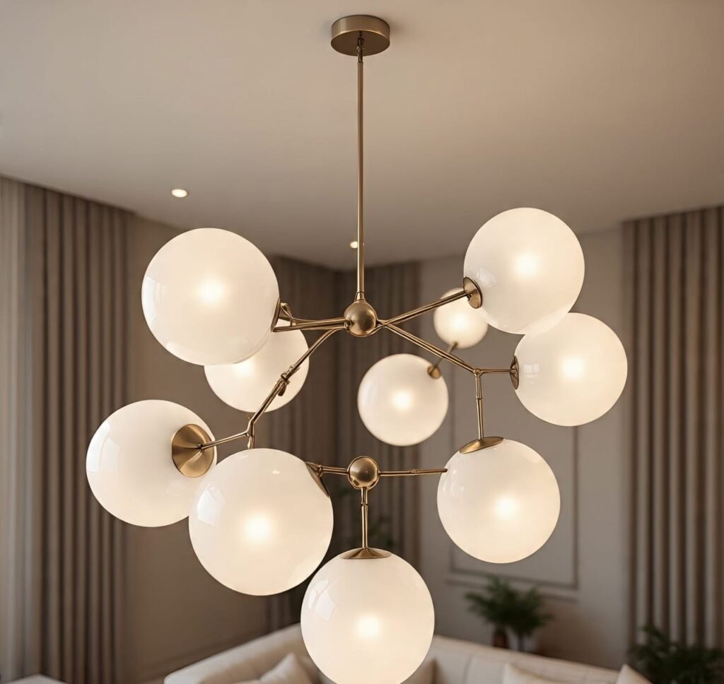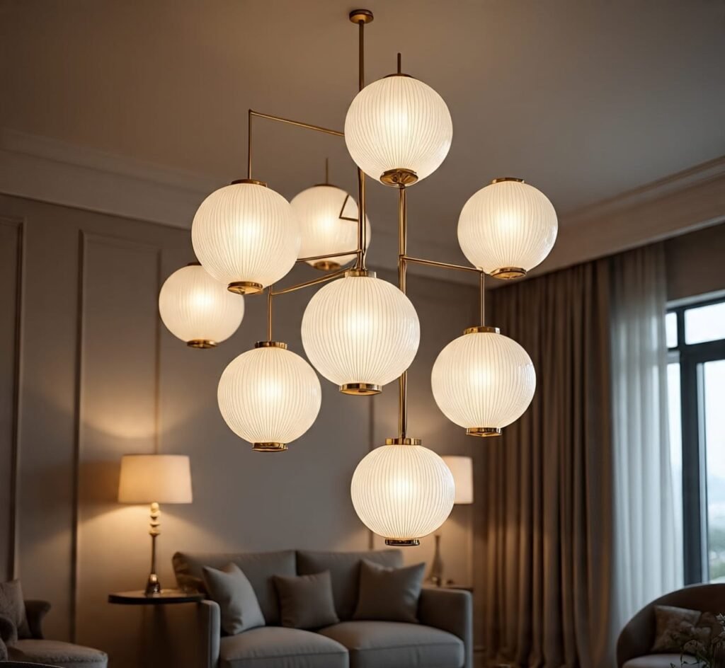 In the twelfth image, clusters of glowing orbs orbit gracefully in a golden embrace. This luxury chandelier design feels like a constellation frozen mid-dance — celestial yet human, organized yet free. Each sphere emits a balanced light that flows evenly across the space, turning simple corners into sanctuaries of calm. Crafted for those who see art in structure, its design celebrates cosmic unity — the link between form, light, and emotion. It fits effortlessly in modern homes that blend luxury with purpose, proving that illumination is more than brightness; it’s belonging.