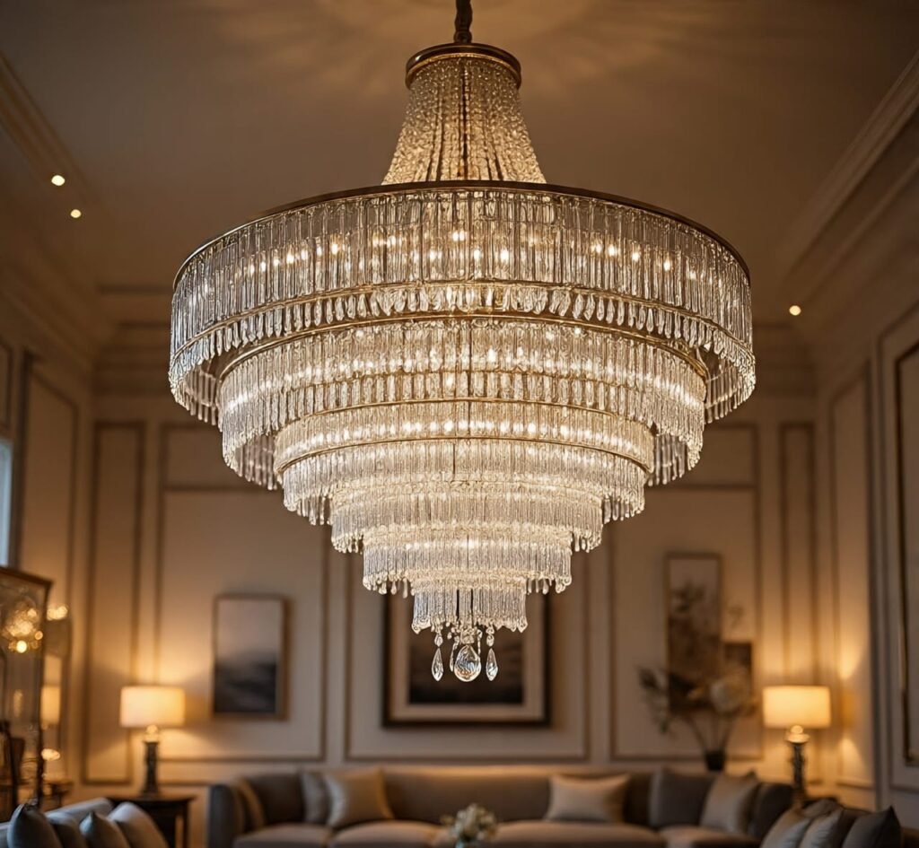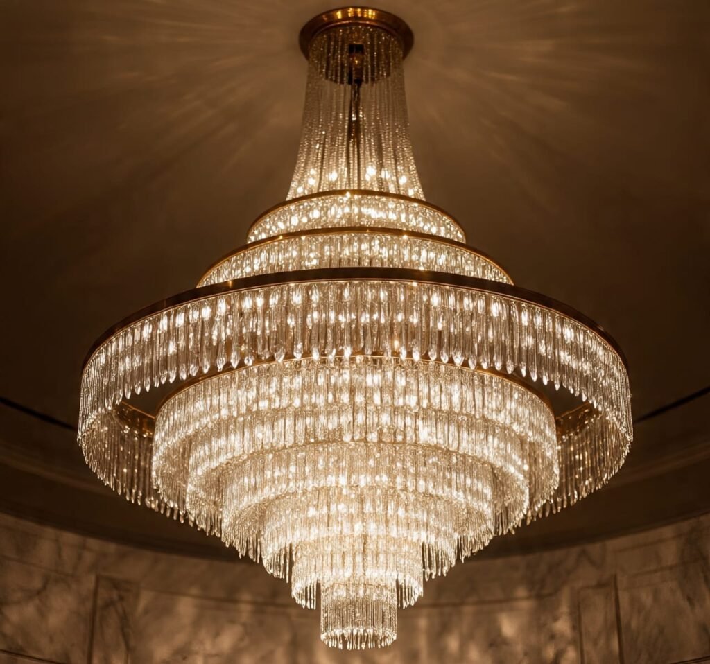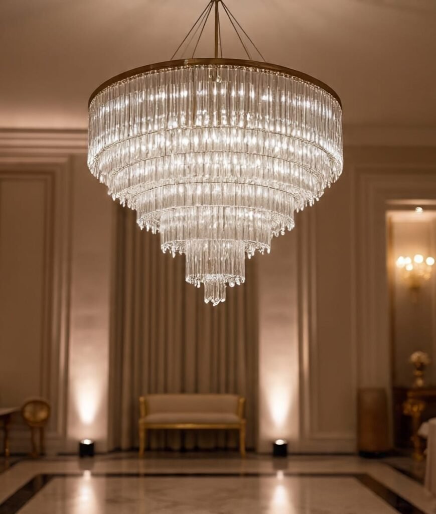 The third chandelier embodies royal craftsmanship at its finest. Its cascading tiers of cut-glass droplets evoke palatial beauty reminiscent of old-world charm. Designed for grand halls and luxurious homes, this luxury chandelier design captures the soul of traditional elegance. Each crystal reflects both craftsmanship and heritage — a gentle nod to the timeless bond between nature’s light and human artistry. Beneath it, golden walls and soft drapery create a serene, majestic harmony. This piece isn’t just décor — it’s legacy suspended in air, a tribute to light’s eternal dance with shadow.