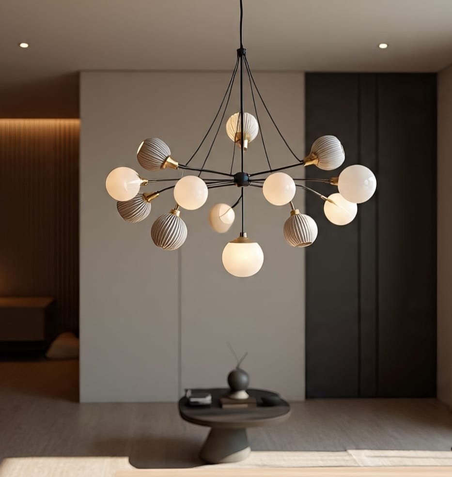 In the eighth photo, the chandelier bursts like a bouquet of glowing seeds — natural, expressive, and alive. Each bulb stretches outward, creating a balanced dance of form and function. This luxury chandelier design captures the beauty of asymmetry, proving that imperfection can be perfect in its own way. It fits effortlessly into contemporary spaces, bringing energy and personality to the room. Its light doesn’t just illuminate — it inspires. When night falls, this piece turns your living space into a canvas painted in golden hues.