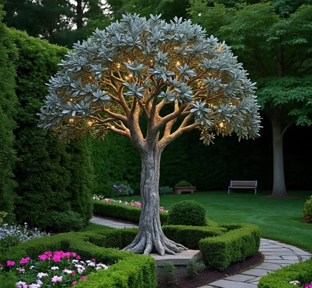 A final vision of grace — silver leaves shimmer like dawn’s first light. This masterpiece blends metal and illumination so naturally that it feels alive. When placed among rocks, flowers, or fountains, it becomes a beacon of elegance and calm. It stands for everything luxury garden decor should be: timeless, inspiring, and deeply connected to the land.