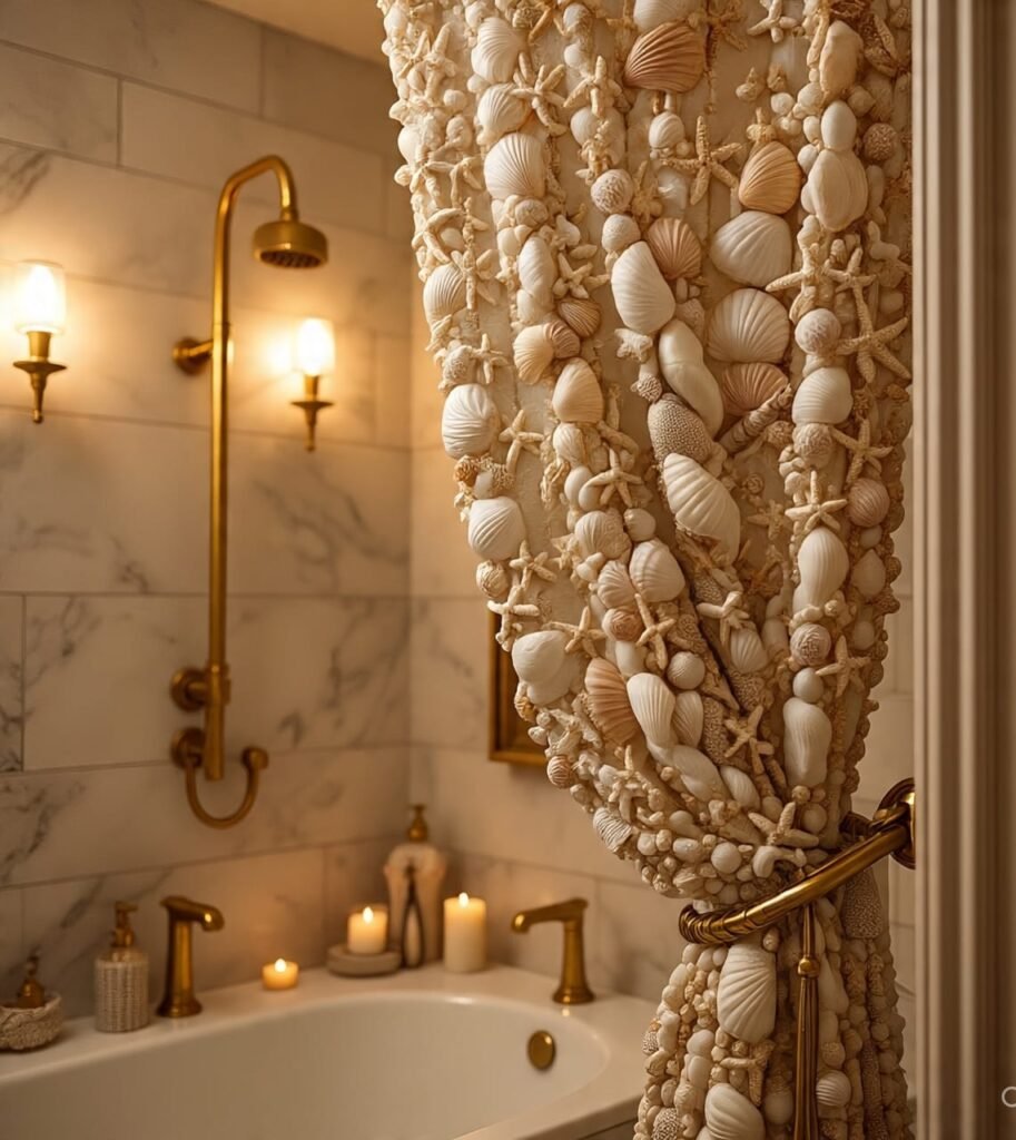 Consciously, next to a standalone vessel with golden fixtures, holds the seashell curtains, candles, and warm lights. Each shell reflects a soft shine and makes patterns like moonlight on water. The layered texture seems to bring the coastline properly to the bathroom, which occurs and falls with an old rhythm. Swimming here seems to have a return to a place blessed by nature, a return from noise and anxiety. Shells are not just decorations – they are a living story about the sea, relaxing in their moments and packing them calmly.