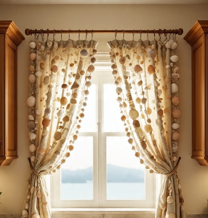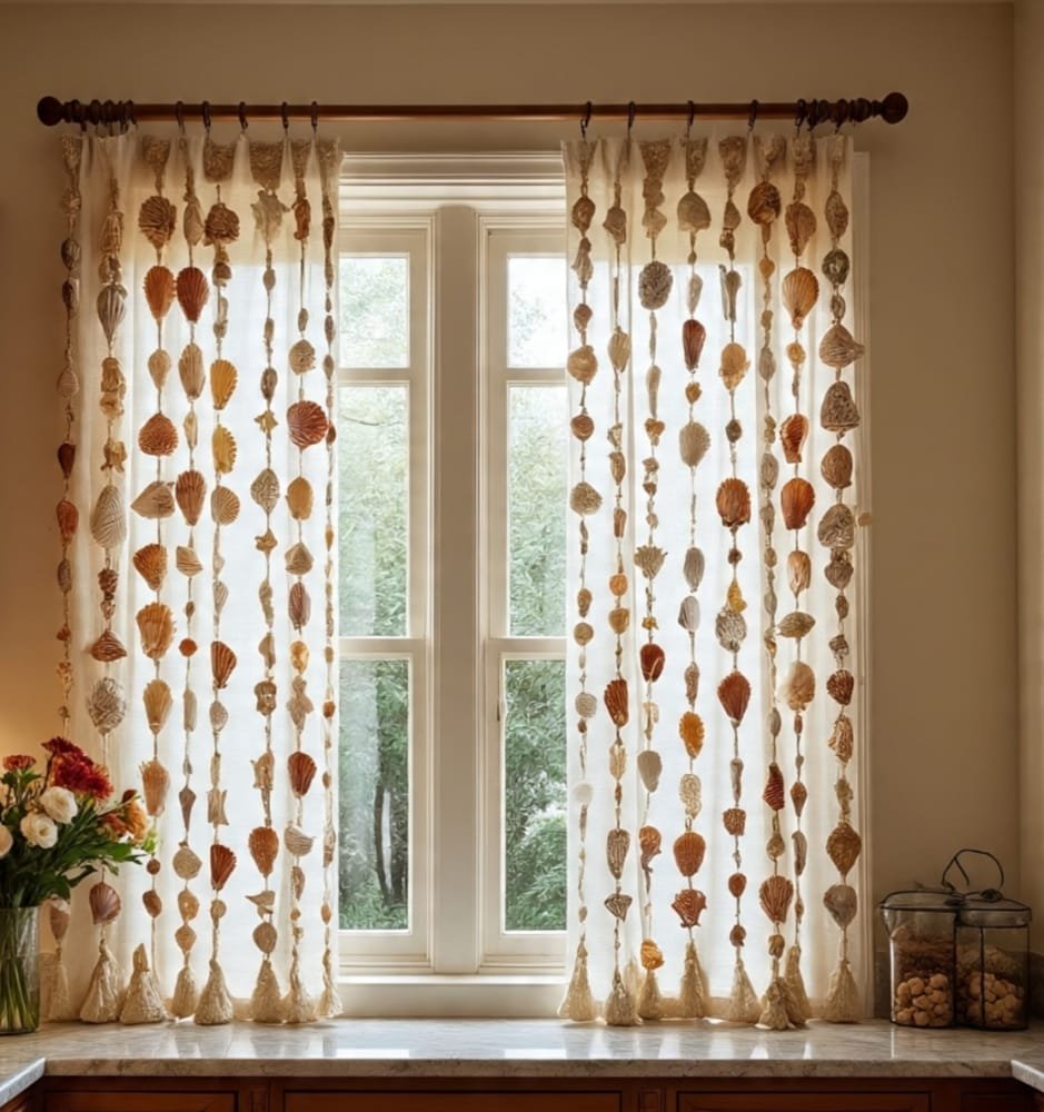 At the first light of morning, seashell curtains awaken before the window like offerings to the tide. Pale shells, strung in patient rows, catch the sunrise and scatter it in soft golden fragments across the wooden floor. Each piece carries the memory of saltwater and distant horizons. The curtain does not block the world; it filters it, allowing light to breathe gently into the room. Cream, ivory, and sandy tones echo coastal dunes shaped by wind and time. As the air moves, the shells whisper together in a faint ocean hymn, delicate yet alive. Transparency blends with privacy in perfect harmony, creating a peaceful coastal interior design that feels grounded and soulful. The window becomes a sacred frame where land meets sea. Texture contrasts beautifully against smooth glass and warm timber. In this setting, seashell curtain decor transforms an ordinary window into a living shoreline, glowing, shifting, remembering. The design feels natural, intentional, and timeless, like waves returning again and again to familiar sand.