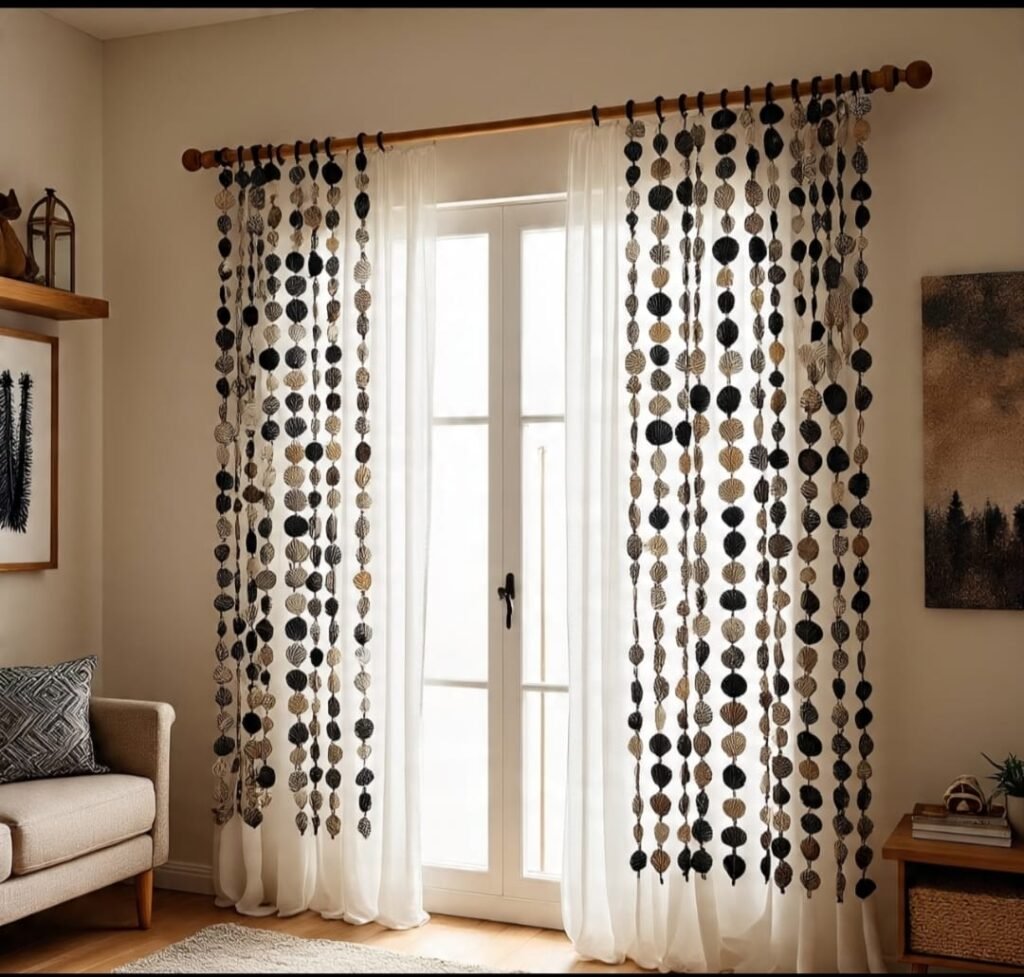 Twin panels of seashell strands frame a central window with graceful symmetry. Balanced on either side, the shells create mirrored patterns as sunlight streams through. Circular reflections scatter evenly across polished floors. The arrangement feels intentional, ceremonial almost. Warm ivory tones complement wooden furniture and neutral walls. Transparency ensures the room remains bright and open. Subtle motion keeps symmetry from feeling rigid. Each shell catches light differently, introducing natural variation within structured layout. Coastal elegance defines the aesthetic—clean lines softened by marine texture. The window becomes anchor of the space. Privacy remains gentle and breathable. Morning light radiates softly through aligned strands, while afternoon glow deepens color warmth. This seashell curtain design exemplifies harmony—order shaped by nature, discipline softened by tide shaped imperfection.