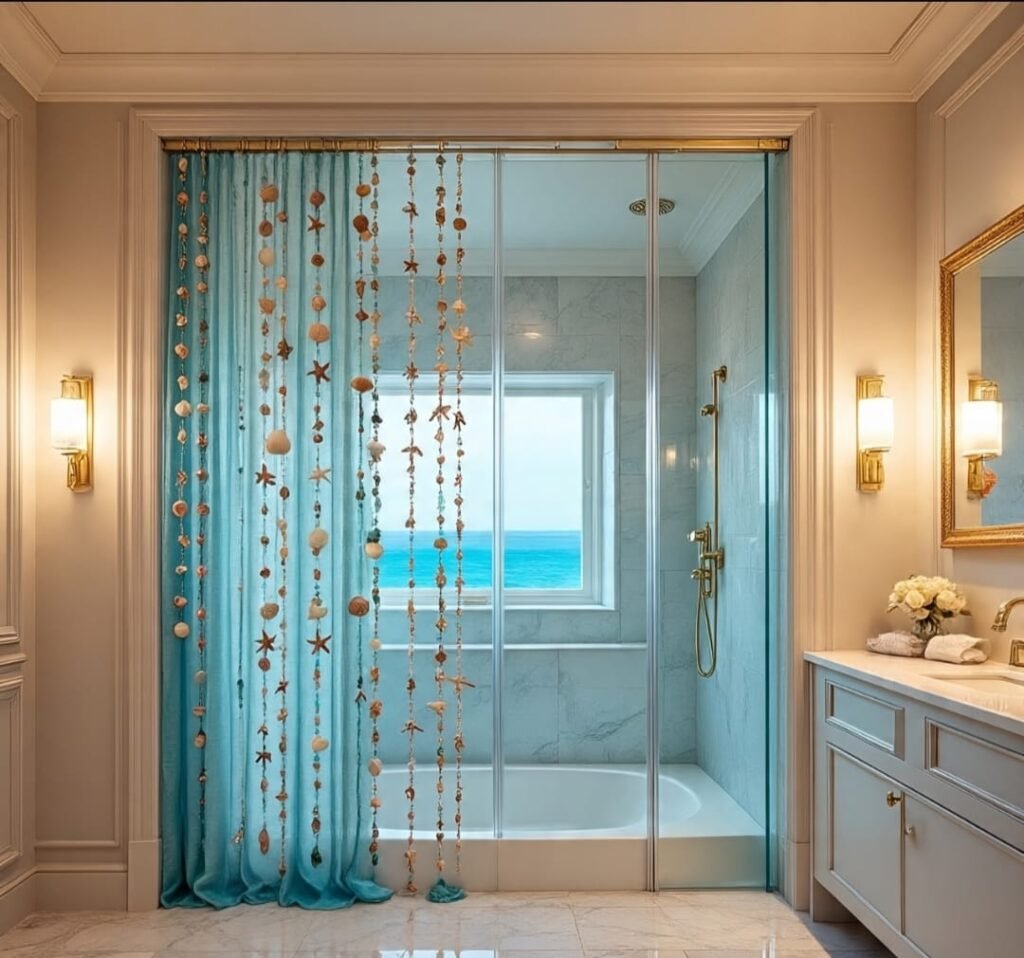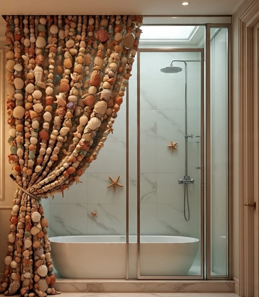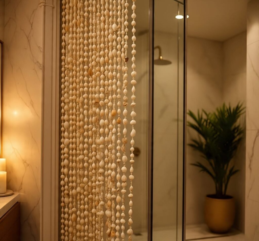 In the shower area, seashell curtains create luminous enclosure. Strands hang before glass, filtering bright bathroom light into softened glow. Steam mingles with reflected highlights, amplifying shimmer. The shells provide privacy while preserving openness. Cool marble surfaces gain warmth through sandy tones. Movement remains minimal yet alive. Sound echoes lightly within tiled chamber. Coastal bathroom decor emerges through this marine texture integration. Transparency prevents heaviness, ensuring airy atmosphere. The curtain elevates routine cleansing into sensory experience shaped by ocean elements. Light ripples across walls like shallow water reflections. Seashell strands stand resilient against moisture, maintaining beauty and purpose. This design unites functionality with natural elegance.