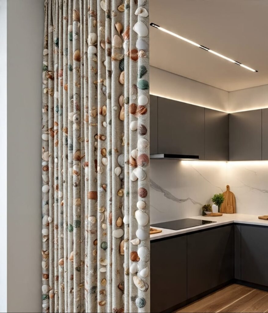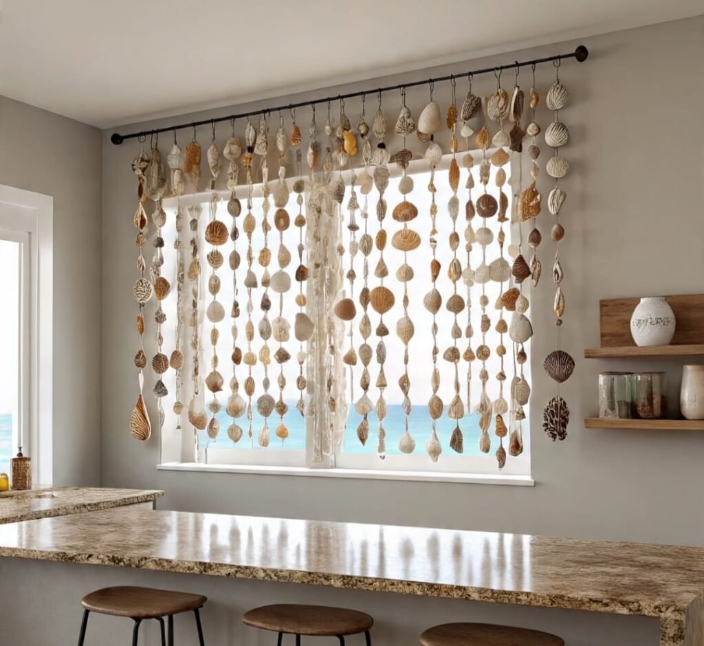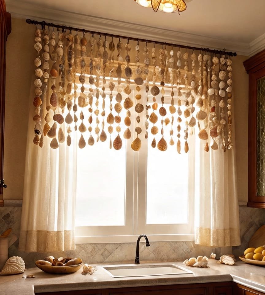 In a sleek, contemporary kitchen, seashell curtains introduce warmth against minimalist lines. Smooth cabinetry and polished surfaces meet organic shell strands that shimmer subtly in daylight. The contrast feels intentional—clean geometry paired with nature’s irregular perfection. Sunlight fractures through overlapping shells, casting fragmented reflections across white countertops. Movement disrupts stillness just enough to bring life into structured design. The shells’ pale tones complement neutral palettes, preventing the room from feeling sterile. Transparency preserves openness valued in modern interiors while adding depth through layered texture. The curtain becomes a focal element without overwhelming simplicity. Natural materials ground the space, reminding us that even in urban settings, coastal inspiration can flourish. The faint clicking sound of shells touching echoes softly in quiet moments. This seashell decor demonstrates how marine elements integrate seamlessly into contemporary home styling, offering balance between innovation and the timeless rhythm of water shaped design.