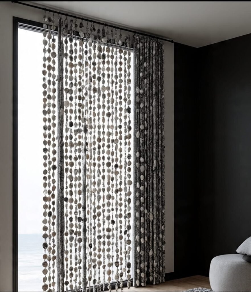 Seventeen visions, seventeen windows, yet one spirit moving through them all. Seashell curtains are not simply decorative pieces; they are fragments of shoreline gathered and suspended in light. Each strand carries the memory of tides, the patience of erosion, the quiet strength of salt and sun. From kitchens to bedrooms, from dramatic modern spaces to tranquil bathrooms, these cascading shells transform architecture into atmosphere.